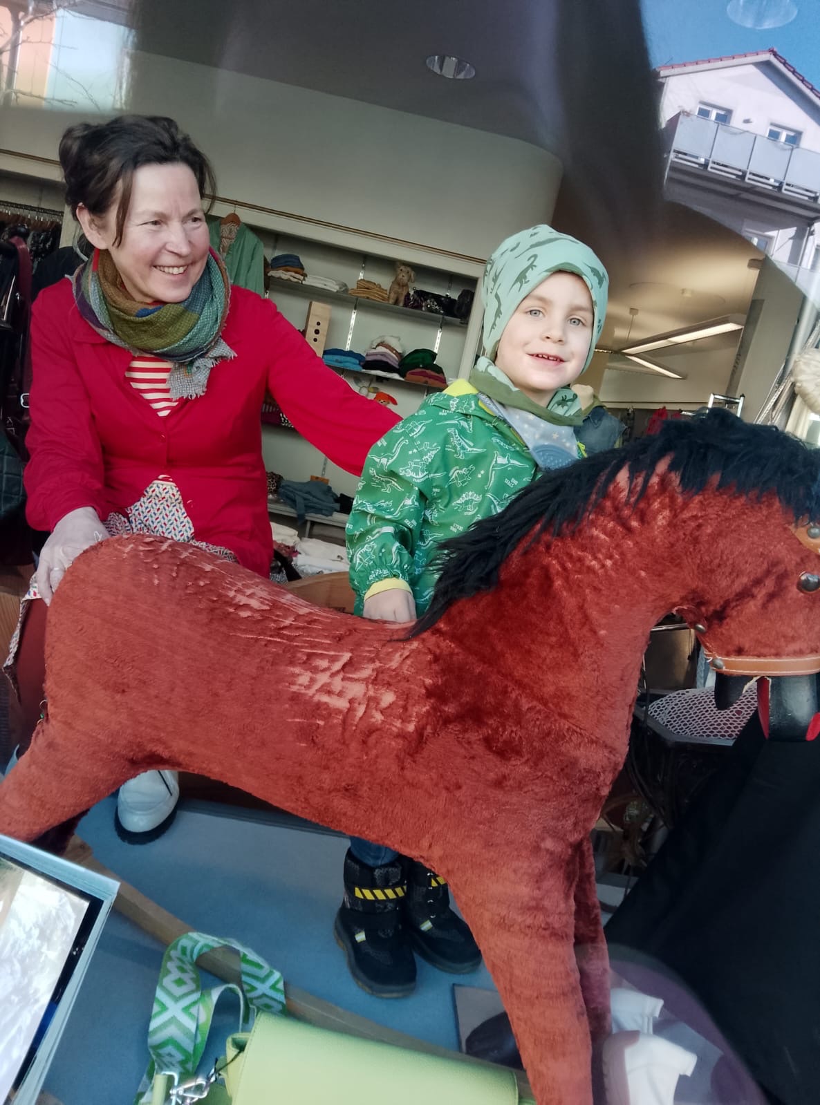 Karlchen und Moni reden im Schaufenster mit dem Pferdchen